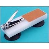 Suitable for persons with reduced hand strength or poor coordination. Combines a nail clipper with a nail sander. Two suction cups keep the unit firmly in place while being used.