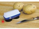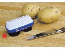 Vegetable scrub brush on suction cups. Can be mounted on kitchen counter or inside the sink. Very helpful for the one handed chef for cleaning vegetables.